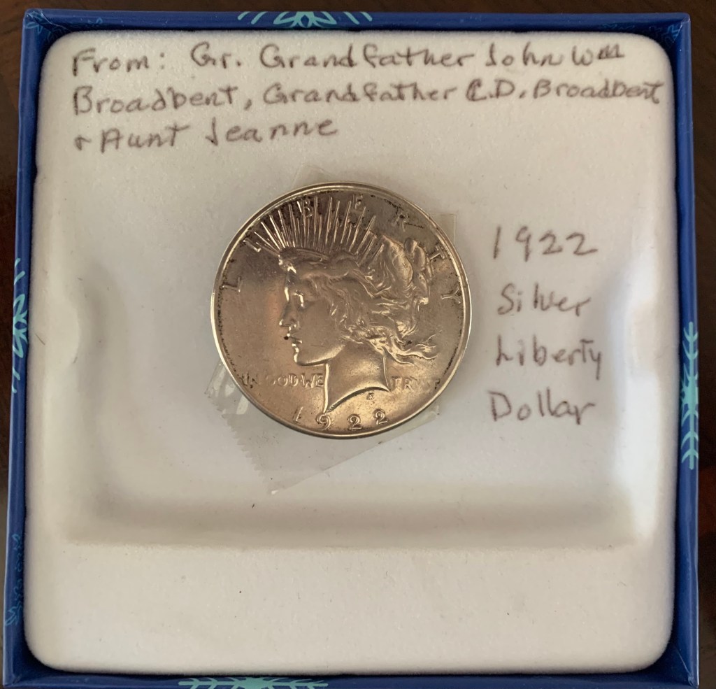 She once sent me a gift for Christmas that I cherish to this day, a 1922 Silver Liberty Dollar. Also known as a Peace Dollar, it was minted in honor of the peace that followed the Great War. She mounted it inside a box and inscribed these words at the top: “From: Gr. Grandfather John Wm Broadbent, Grandfather C.D. Broadbent + Aunt Jeanne.”